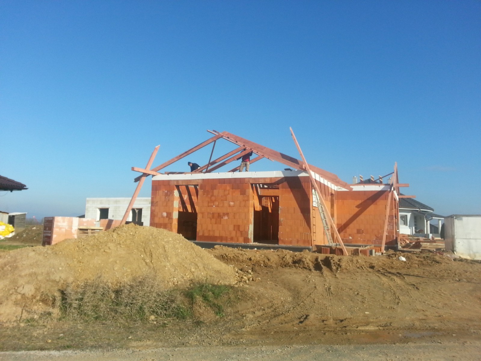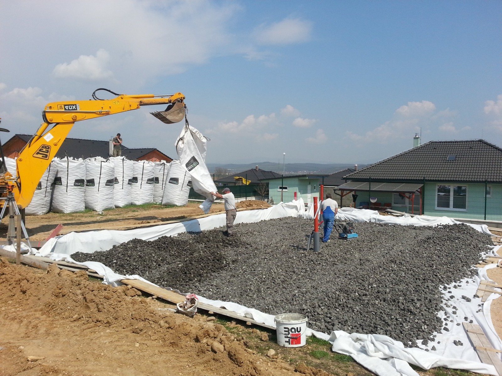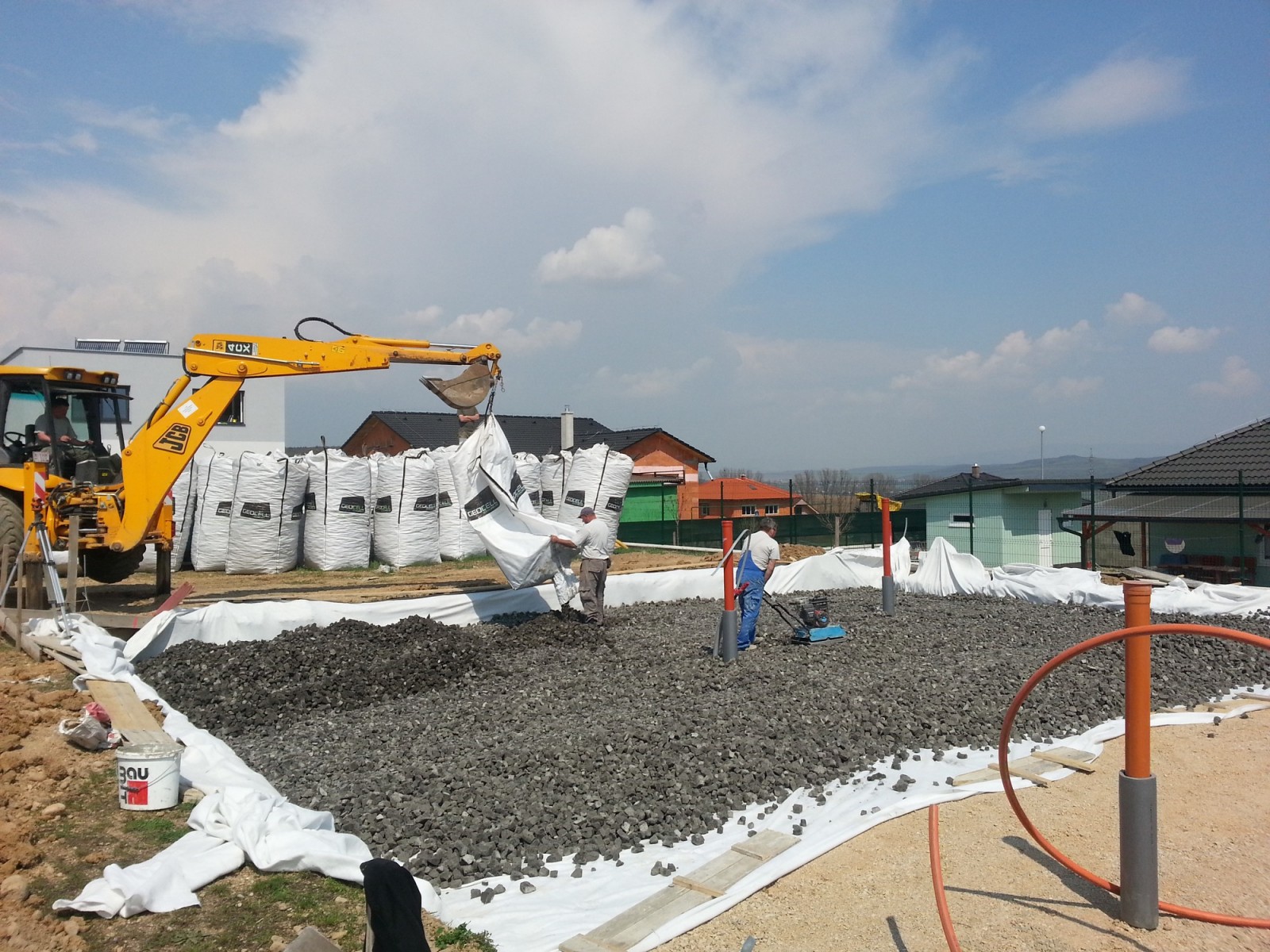 Gépi földmunkák, alapozás, falazás, monolit födém (vas-szerelések), fa tetőszerkezetek építése, hőszigetelés, térkövezés, közösségi terek kivitelezése.